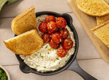 Prepared with cottage cheese for extra protein, this whipped feta dip is topped with seared cherry tomatoes and fresh herbs. It’s served with toasted Villaggio® Rustico™ Sourdough for a crowd-pleasing appetizer that’s easy to make.